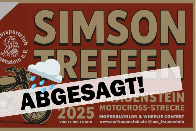 Petrus meint es nicht gut mit uns...zu den Windböen kommt nun leider auch noch ordentlich Regen dazu. Wir müssen das SIMSON-TREFFEN am 04.10. leider ersatzlos absagen. Wir arbeiten 2026 an einem neuen Termin. Danke für euer Verständnis...bis bald